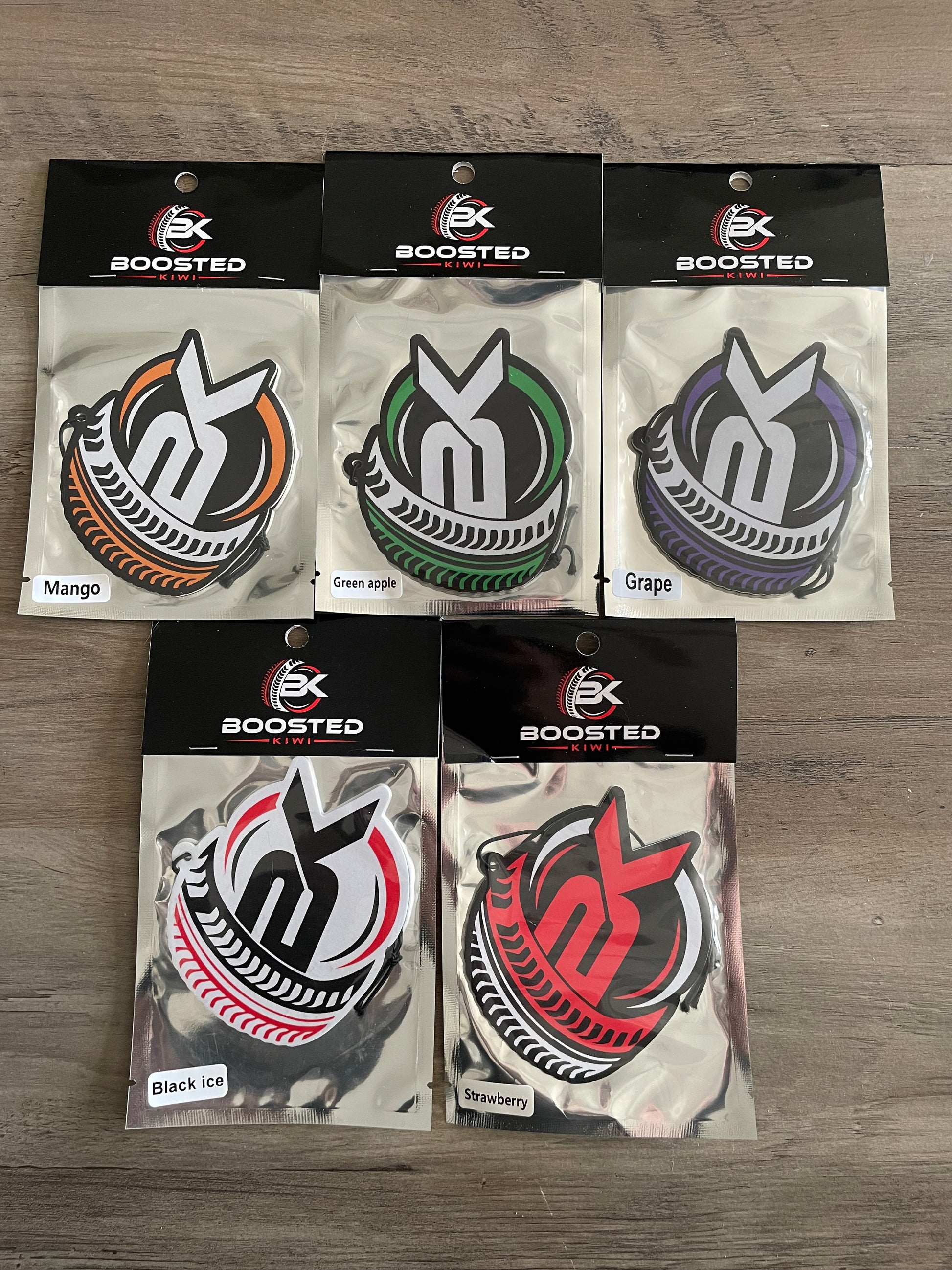 Our Boosted Kiwi air fresheners allow you to spice up your ride in style! These cool looking paper air fresheners will give your car the freshen-up that it needs, without being to overpowering!
